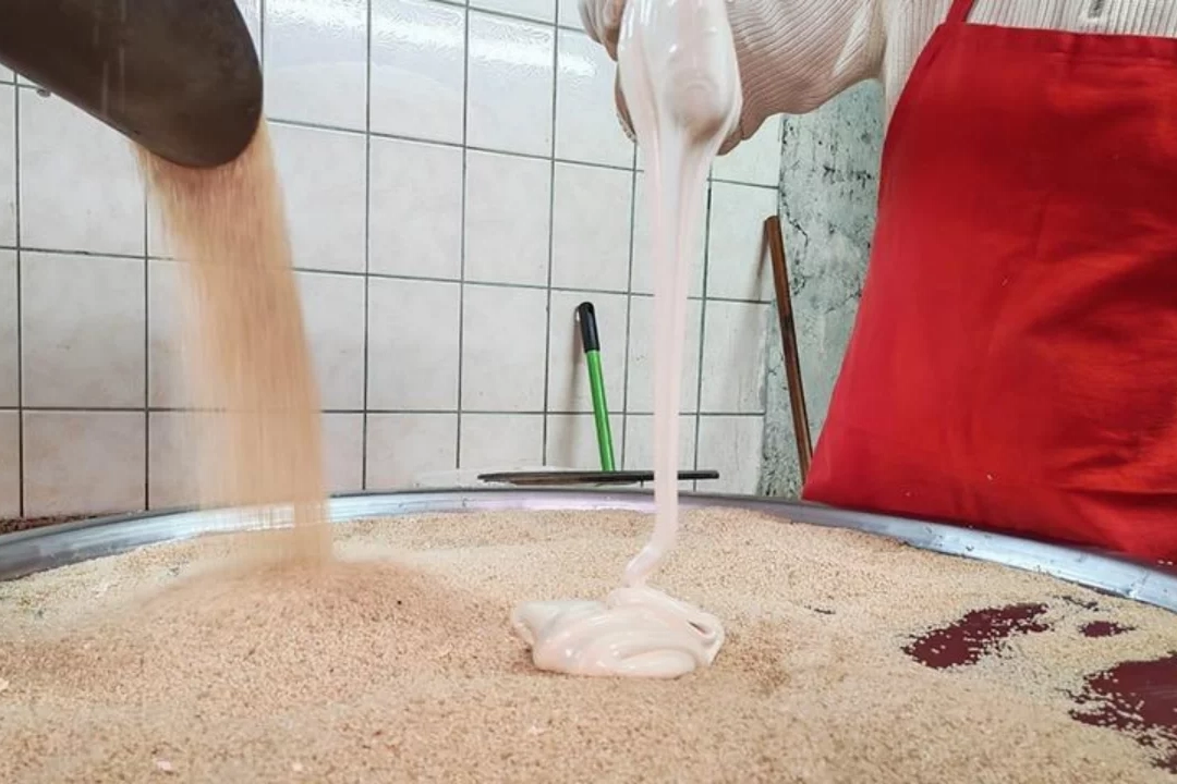 İçerisinde glikoz veya yapay tatlandırıcı bulunmayan helva; su, şeker, limon suyu ve çöven otunun ateşte kaynatılmasıyla hazırlanan ağdanın, tahta kepçelerle kıvam alması ve çifte kavrulmuş susamla buluşmasıyla üretiliyor.