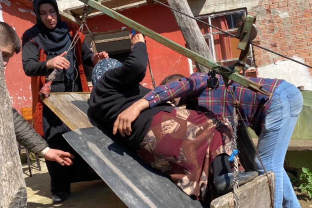 Annesini ilkel teleferiğe bindirirken büyük korku yaşadıklarını belirten Mustafa Bozkurt ise "Annemi hastalandığı zaman teleferikle aşağıya indirip, çıkarıyoruz. Korkuyoruz ama yapacak bir şeyimiz yok. Annemi sırtıma alıp, bu patikadan indirmeye çalışsam çok riskli; kayabiliriz. Tek başıma indiremiyorum. Sedyeyle de inmiyor. Buradan teleferik yavaş yavaş verilirse, 15 dakikada aşağıya iniyor. O, 15 dakika içerisinde, 'Acaba annem aşağıya indi mi yoksa düştü mü?' diye bekliyoruz. Burada araç yolu olmadığı için annemi, bu tehlikeli teleferiğe bindirmek zorunda kalıyorum. Aşağıya inene kadar da kendimi çok kötü hissediyorum" diye konuştu.