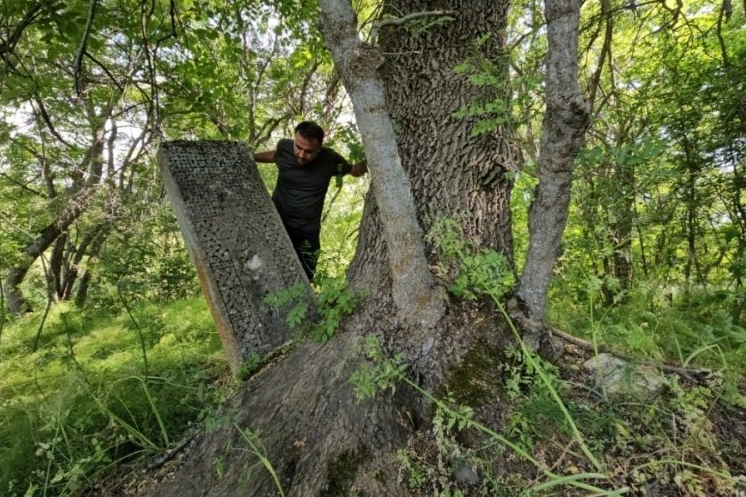 Öte yandan, mezarlık alanını ziyaret eden vatandaşlar da ağaçların gövdesine saplanan mezar taşları karşısında hayrete düştü.