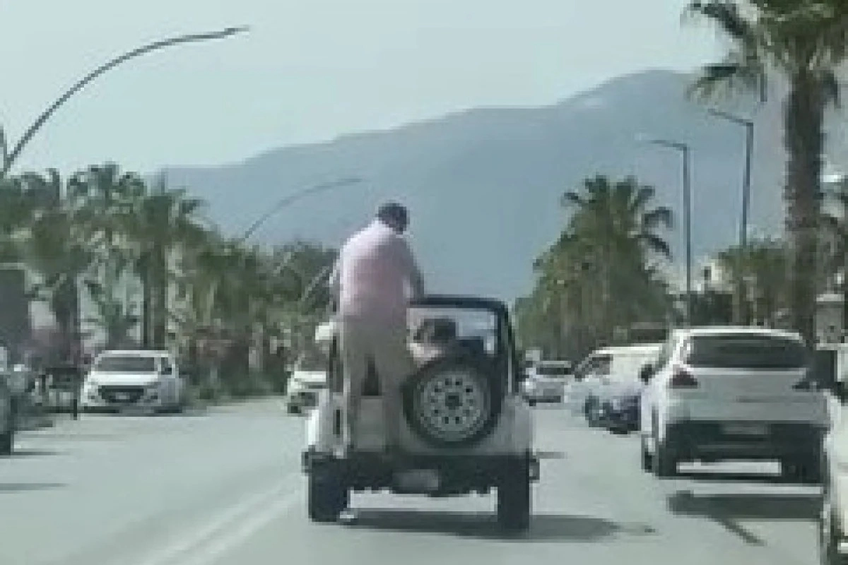 Turist, araç üzerinde akrobatik hareketler yaparak trafiği tehlikeye düşürdü.