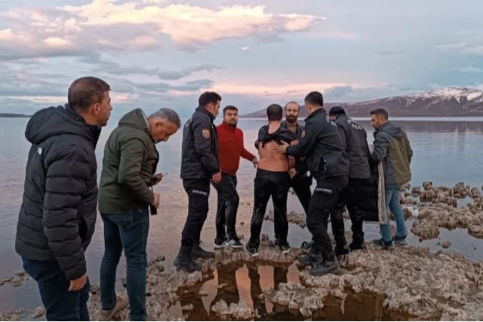 Tatvan İlçe Emniyet Müdürlüğünde görevli iki polis memuru, soğuk havaya rağmen kıyafetleriyle göle girerek şahsa ulaştı.