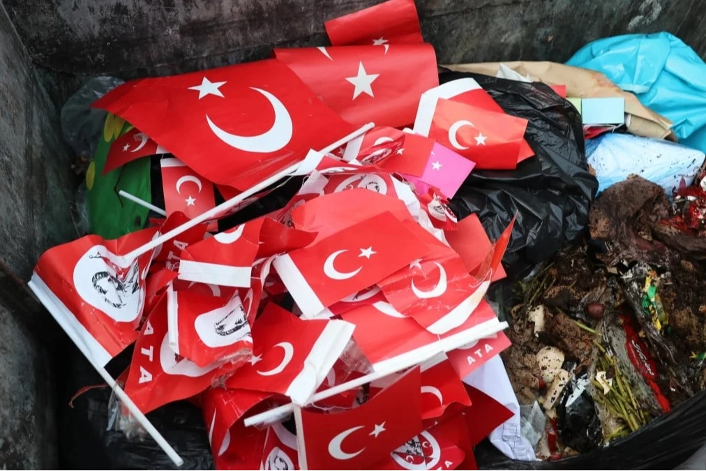 Ekipler, çöp konteynerinin yakınında bulunan Hüseyin Ak Ortaokulu'nun müdürü ile kamera kayıtlarını incelemelerinin ardından bayrakları delil torbasına koyarak bölgeden ayrıldı.
