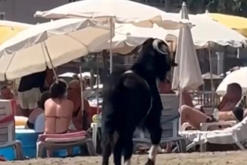 Şezlonglar ve güneşlenen tatilcilerin arasına giren keçi, sahilde bir süre dolaştı. O anlar çevrede bulunan bir vatandaş tarafından cep telefonu kamerasıyla görüntülendi.