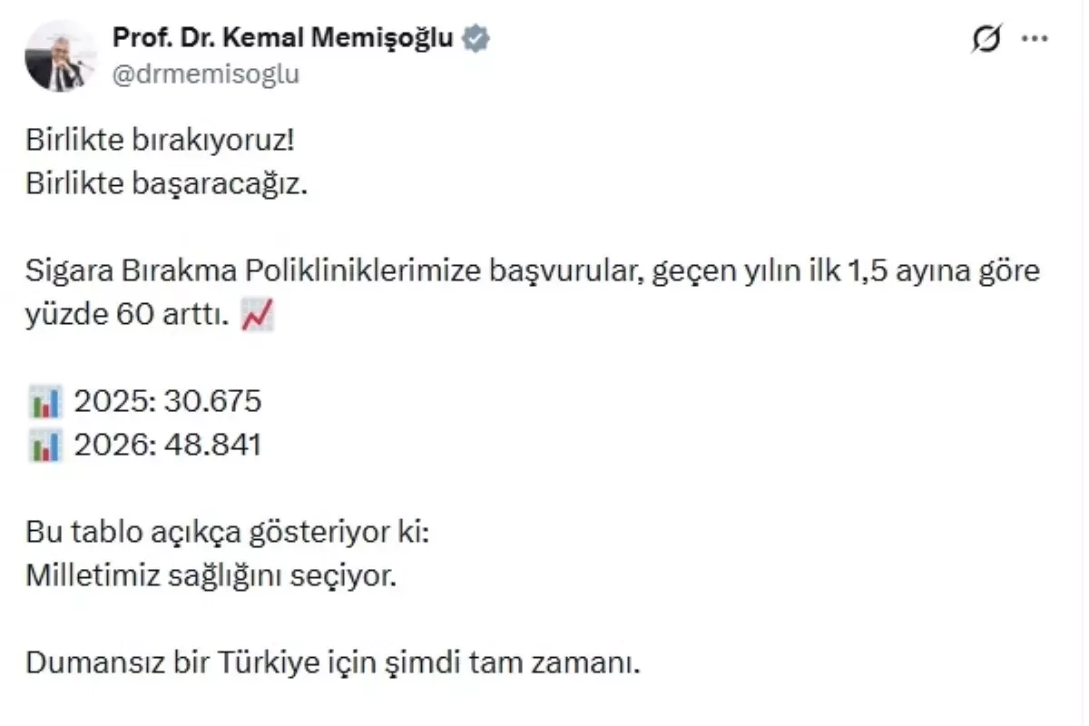 Sağlık Bakanı Kemal Memişoğlu, sanal medya hesabından 'Birlikte bırakıyoruz! Birlikte başaracağız' başlığı ile Türkiye'de Sigara Bırakma Polikliniklerine yapılan başvuruların, geçen yılın ilk 1,5 ayına göre yüzde 60 arttığını açıkladı. Memişoğlu paylaşımında, 2025 yılında 30 bin 675 başvuru, 2026 yılında 48 bin 841 başvuru yapıldığını belirterek, "Bu tablo açıkça gösteriyor ki, milletimiz sağlığını seçiyor. Dumansız bir Türkiye için şimdi tam zamanı" ifadelerini kullandı.