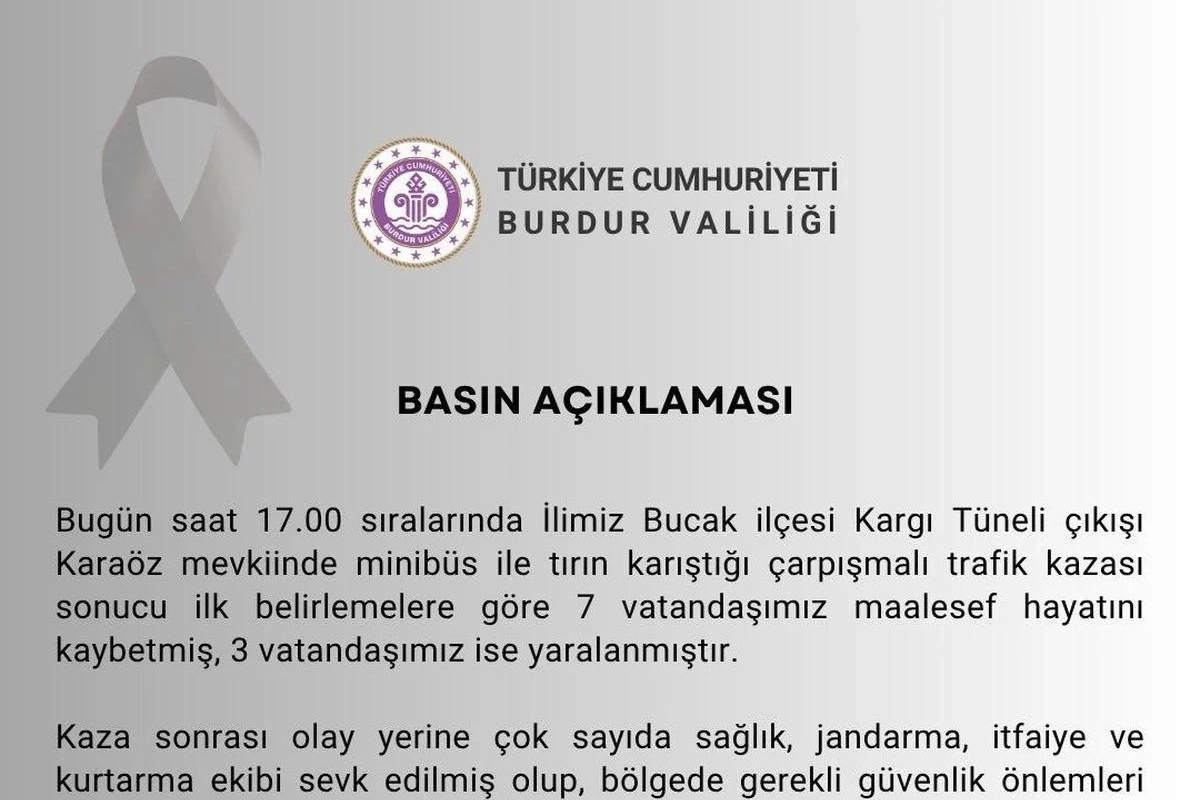 Burdur Valiliği'nden kazaya ilişkin sosyal medya üzerinden yapılan açıklamada, "Bugün saat 17.00 sıralarında ilimiz Bucak ilçesi Kargı Tüneli çıkışı Karaöz mevkisinde minibüs ile beton mikserinin karıştığı çarpışmalı trafik kazası sonucu ilk belirlemelere göre 7 vatandaşımız maalesef hayatını kaybetmiş, 3 vatandaşımız ise yaralanmıştır. Kaza sonrası olay yerine çok sayıda sağlık, jandarma, itfaiye ve kurtarma ekibi sevk edilmiş olup, bölgede gerekli güvenlik önlemleri alınmıştır. Yaralı vatandaşlarımız çevredeki hastanelere sevk edilerek tedavi altına alınmış, ekiplerimizin olay yerindeki çalışmaları titizlikle sürdürülmektedir. Yol, kontrollü şekilde trafiğe açılmıştır. Hayatını kaybeden vatandaşlarımıza Allah'tan rahmet, kederli ailelerine ve yakınlarına başsağlığı, yaralı vatandaşlarımıza acil şifalar diliyoruz" denildi.