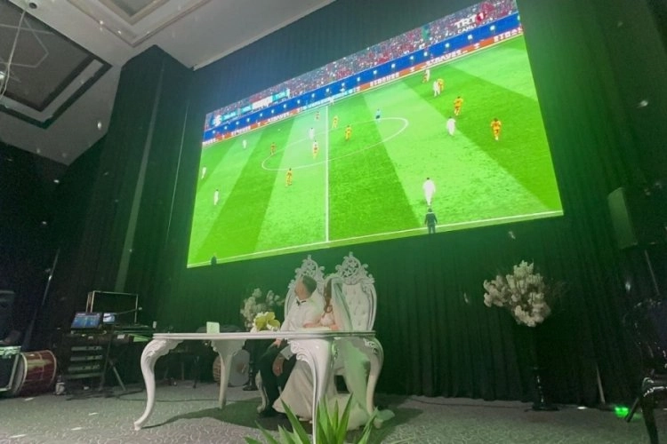 Türkiye A Milli Futbol Takımı'nın bugünkü karşılaşmasında düğünleri olan Kamil Can ve Gökce Can çifti maçı düğün salonunda izledi.