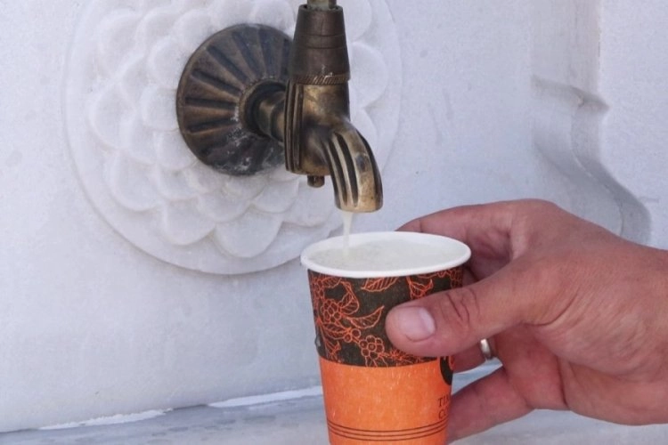 CAMİ ÖNÜNDEKİ ÇEŞMEDEN BARDAKLARA DOLDURULUYOR