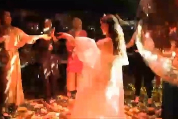 Görüntülerde, gelinin dans ettiği anda disko topunun gelinin üstüne düştüğü görülüyor.