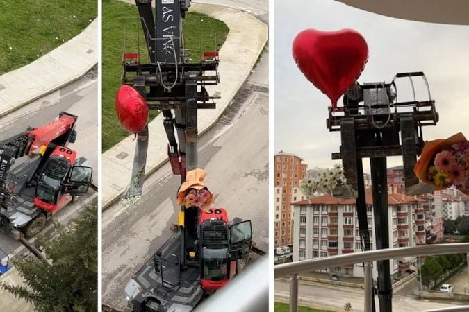 Gül buketi ve kalp şeklindeki balonu makinenin uzayan koluna bağlayan operatör, apartman önüne gelerek sürprizi başlattı.