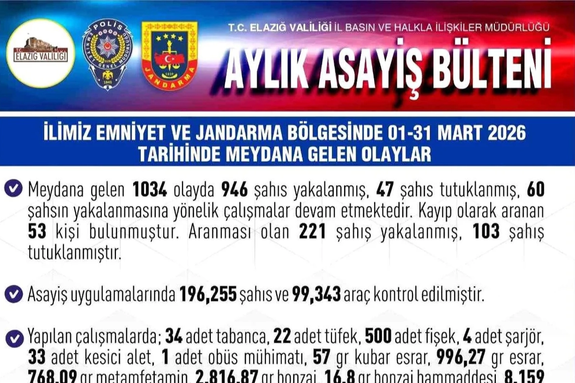 Elazığ Valiliği, 01-31 Mart 2026 tarihlerini kapsayan asayiş bültenini yayımladı. Bültende yer alan bilgilere göre, kent genelinde meydana gelen bin 34 olayda 946 şahıs yakalandı, 47 kişi de tutuklandı. Yine aranması olan 221 şahıs yakalanırken 103'ü tutuklandı. Çalışmalarda 196 bin 255 şahıs ve 99 bin 343 araç denetlendi. Kontrol edilen araçlardan, 11 bin 413'üne cezai işlem uygulanırken 823 araç da trafikten men edildi. Kent genelinde meydana gelen 140 adet trafik kazasında 252 kişi yaralandı.