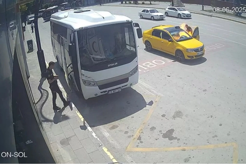 Aracın bir anda alev alması ve sürücünün son anda kurtulması güvenlik kameralarına saniye saniye yansıdı.
