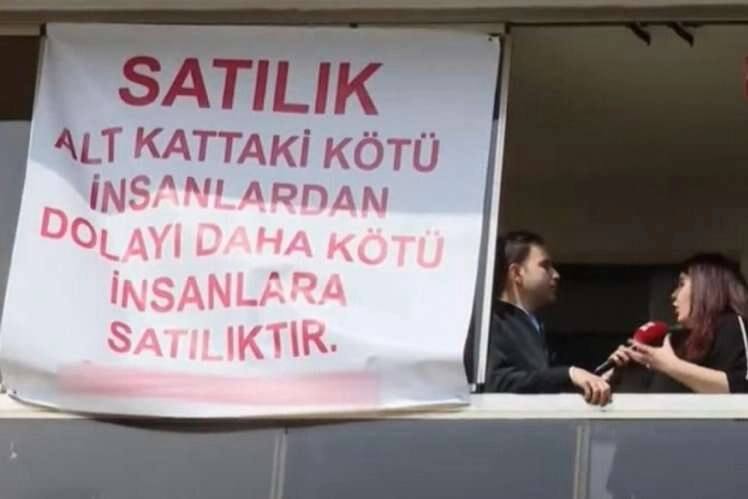 Tekirdağ'da bir kadın, komşu ile başa çıkamayınca evini satışa çıkardı ve evine de 'Alt kattaki kötü insanlardan dolayı daha kötü insanlara satılıktır' yazısı astı.