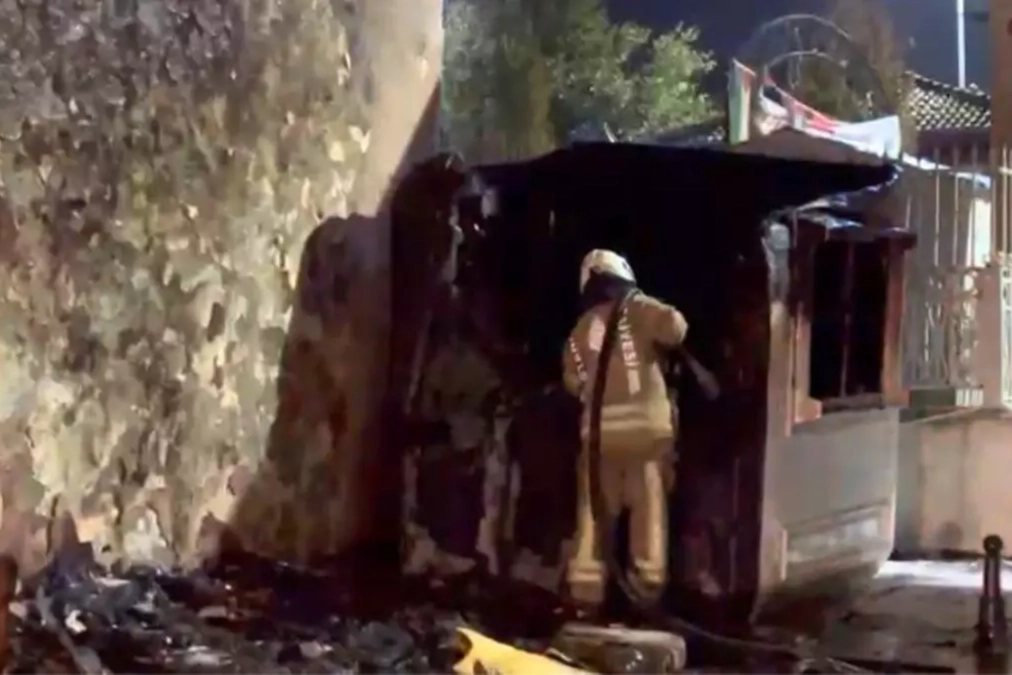 İstanbul Fatih'te cami dışındaki güvenlik kulübesi alev alev yandı.