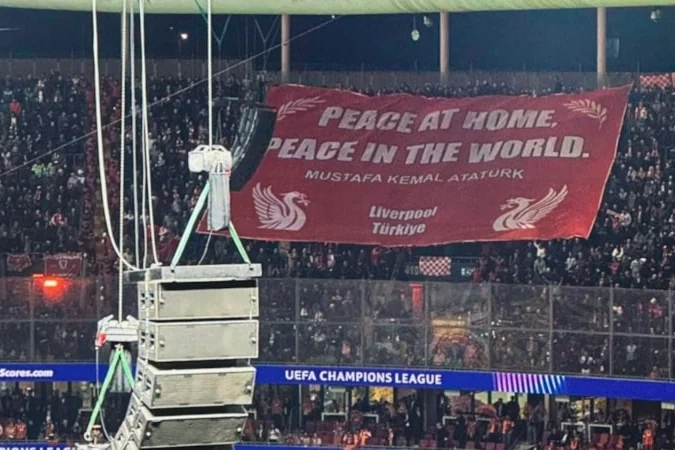 Liverpool taraftarlarları, Mustafa Kemal Atatürk'ün "Yurtta sulh, cihanda sulh" sözünü İngilizce olarak yazılı pankart açtı.