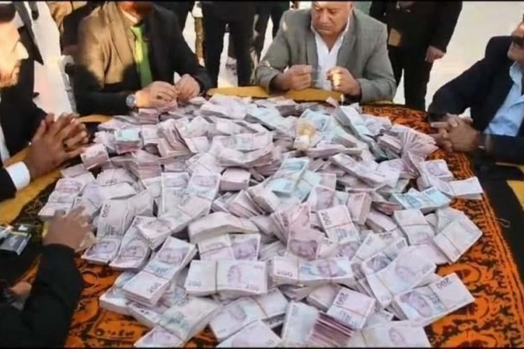 Takılan parayı yaklaşık 25 kişi sayarken, gelin Hasret Bilici'nin üzerindeki takıları taşımakta zorlandığı görüldü. Toplanan paralar ise bavullara konularak taşındı.