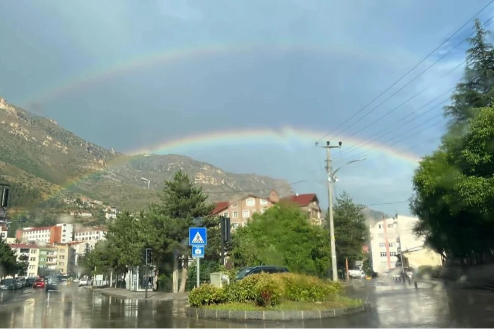 Yağmurun ardından ortaya çıkan güneş gökyüzünde gökkuşağı oluşmasına neden olurken gökyüzünün güzelliklerinden olan gökkuşağını gören vatandaşlar cep telefonuna sarılarak bu anı ölümsüzleştirdi.
