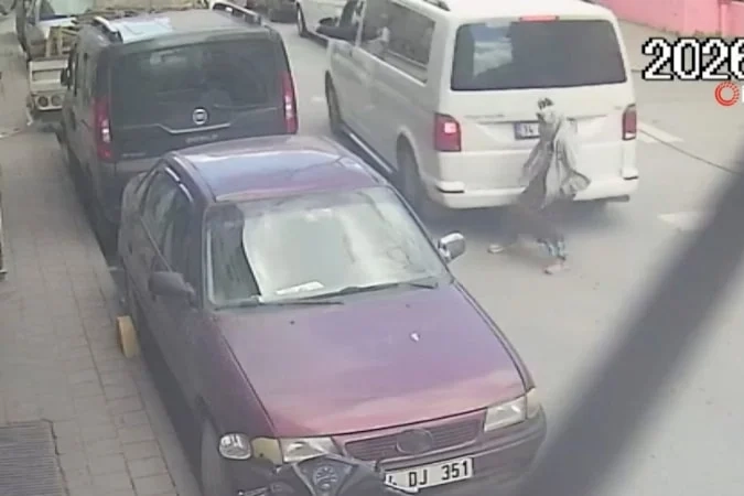 Güvenlik kamerasına yansıyan görüntüde geri manevra yapan bir minibüs, yoldan geçen kadına çarptı.