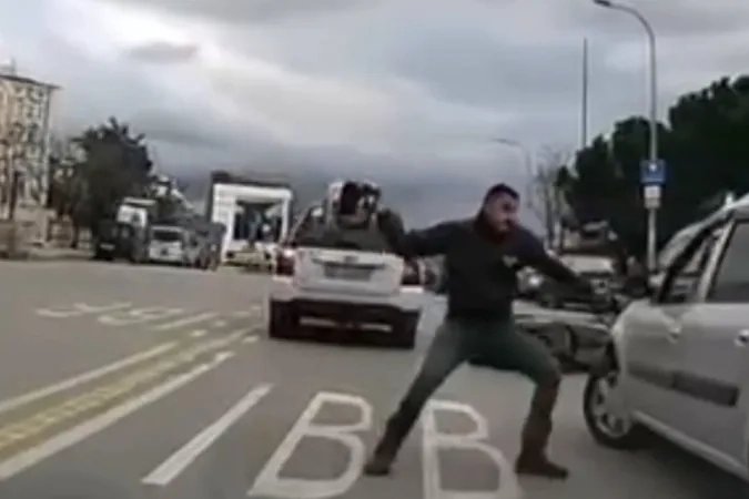 Kavgada hafif ticari araç sürücüsü aracını motosikletlinin önüne kırdı, motosiklet sürücüsü ise araca tekme atmaya çalıştı.