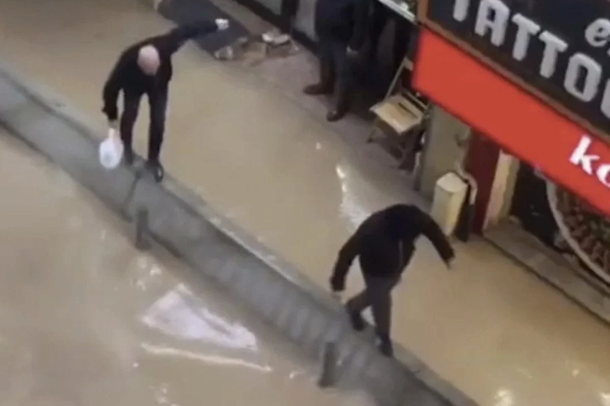 Vatandaşların, derin su birikintisinde kollarını açıp dengesini korumaya çalıştığı cep telefonu kameralara yansıdı.