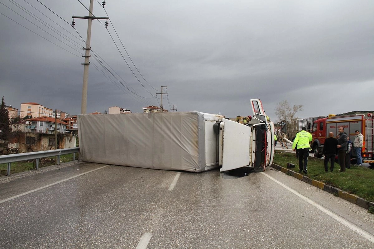 MANİSA'nın Kula ilçesinde, yağmur nedeniyle kayganlaşan yolda devrilen kamyonun şoförü Ümit İdem yaralandı. Kaza, bir binanın güvenlik kamerasına yansıdı.