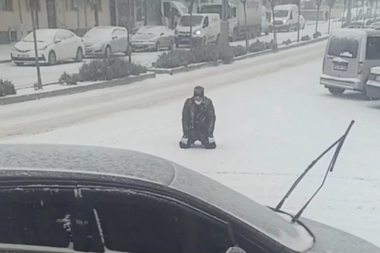 Sabah saatlerinde etkili olan kar yağışı sırasında bir vatandaş, cadde ortasında secde etti. O anlar kameralara yansıdı.