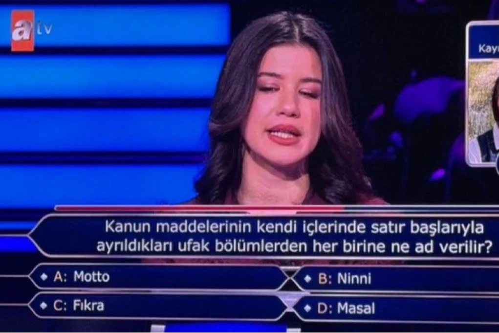 "Kanun maddelerinin kendi içlerinde satır başlarıyla ayrıldıkları ufak bölümlerden her birine ne ad verilir?" sorusunda zorlanınca telefon joker hakkını kullandı.Sorunun cevabını hukuk hocasından alan yarışmacının bu anları kısa sürede sosyal medyada gündem oldu.Sorunun doğru cevabı ise 'C:Fıkra' olarak verildi.