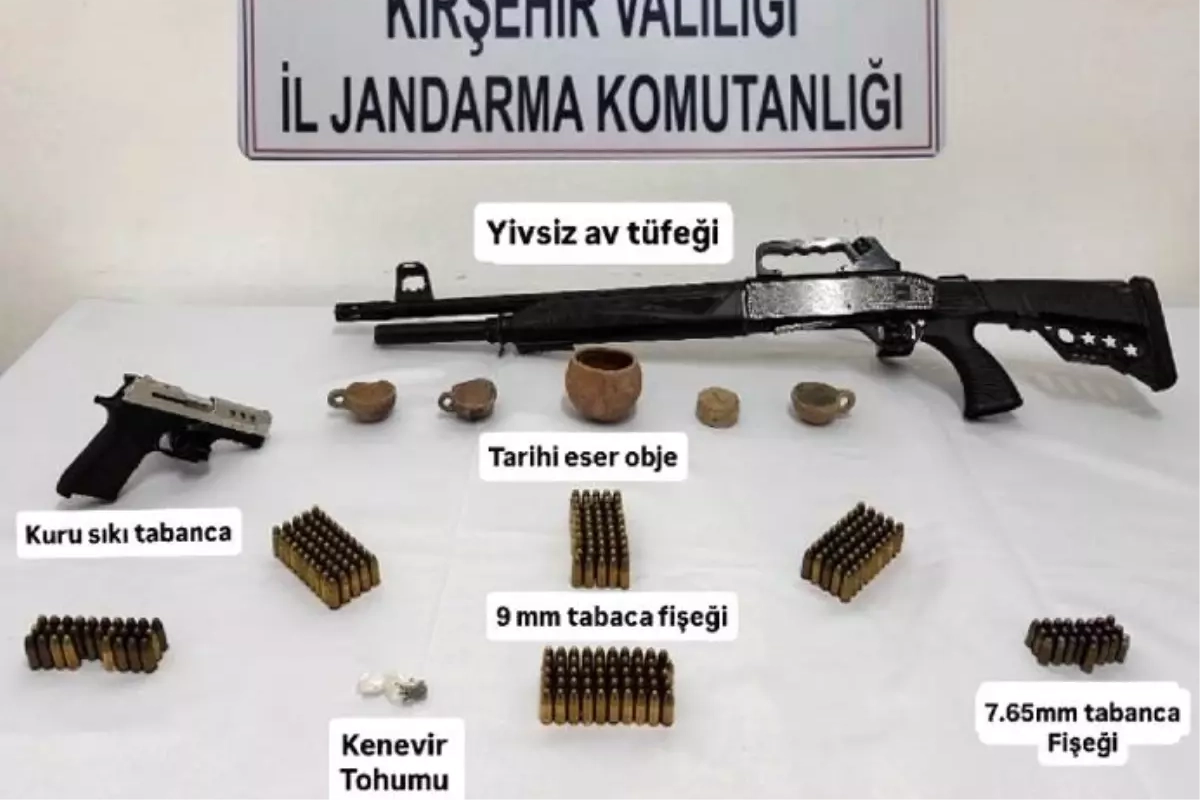 KOM Şube Müdürlüğü ile Çiçekdağı İlçe Jandarma Komutanlığı tarafından yapılan çalışmalarda, M.T.E. isimli şahsın ikametinde arama yapıldı. Yapılan aramalarda; 34 kenevir tohumu, 5 tarihi eser niteliğinde obje, 1 kurusıkı tabanca, 1 ruhsatsız av tüfeği, 228 tane 9 milimetre tabanca fişeği, 25 tane 7,65 milimetre tabanca fişeği ele geçirildi.