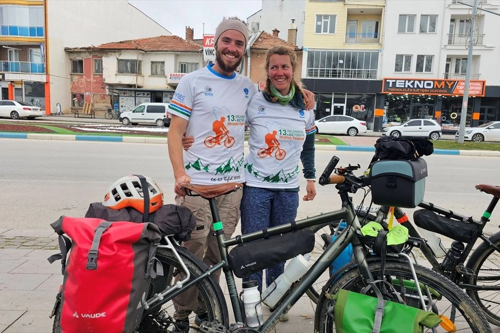 Konya'nın Beyşehir ilçesinde bisikletleriyle dünya turuna çıkan Fransalı çift mola verdi.