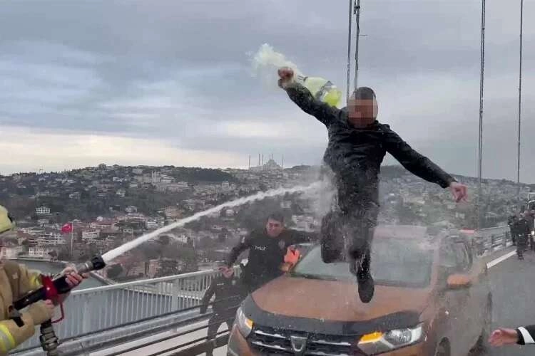 İstanbul'da 15 Temmuz Şehitler Köprüsünde durdurduğu otomobilinin üzerine çıkıp kendisinin ve aracının üzerine benzin döken şahıs ekipleri harekete geçirdi. Polisin ikna çabaları, şahsı otomobilin üzerinden indirmeye yetmeyince itfaiye eri şahsın üzerine hortum ile su sıktı.