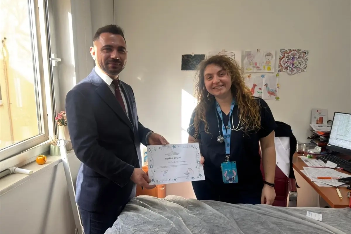 Hastane Başhekimi Dr. Fırat Güneş tarafından Fişek'e teşekkür belgesi takdim edildi.
