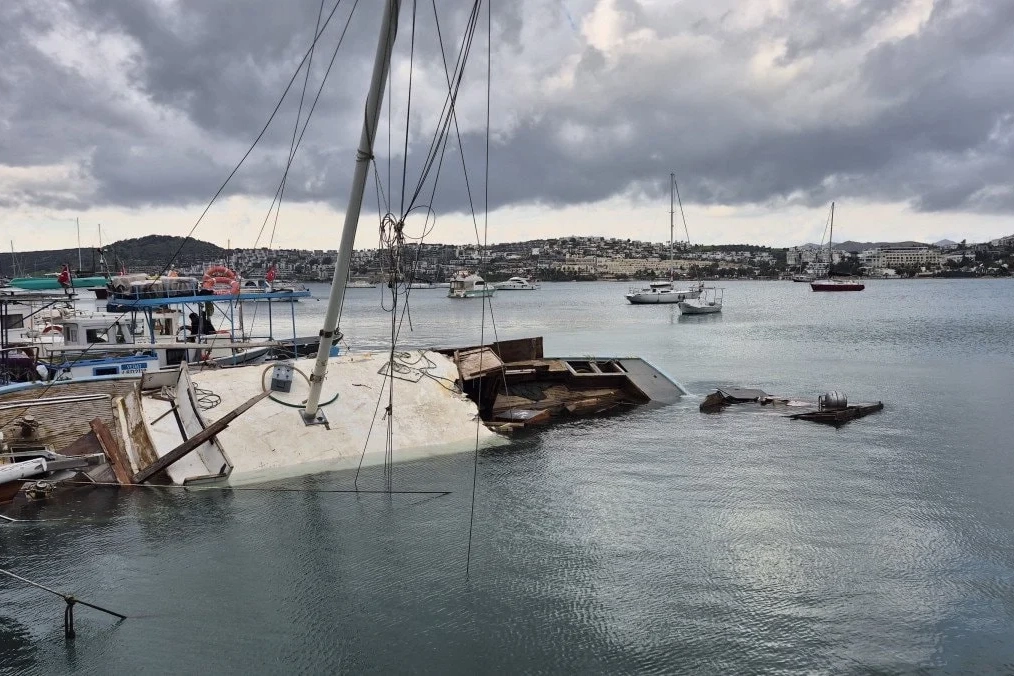 Yaklaşık 13 metre uzunluğundaki yelkenli, kısa sürede yarı batık hale gelirken, teknenin bazı bölümlerinin kırılarak denize düştüğü gözlendi. Su üzerinde tahta parçaları ve üzerlerinde bulunan bir tüp dikkat çekti.