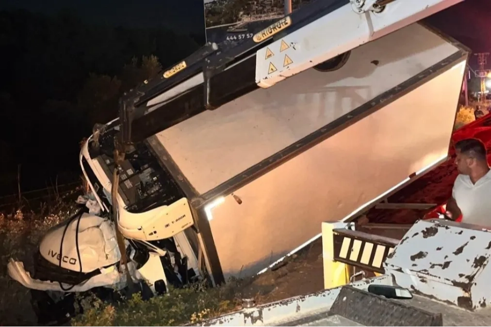 Muğla’nın Milas ilçesinde Kemikler Mahallesi mevkiinde saat 19.00 sıralarında, Aydın Öz (53) idaresindeki kamyon sürücüsünün direksiyon hakimiyetini kaybetmesi sonucu yoldan çıkarak devrildi.