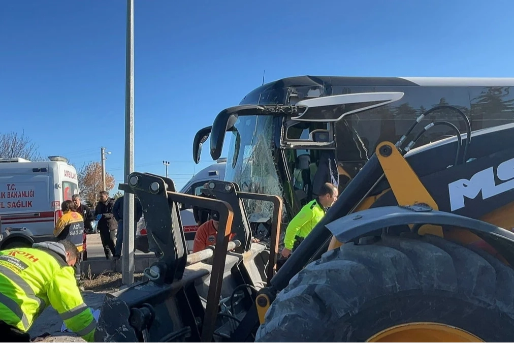 Kontrolden çıkan turist otobüsü, refüje çıkarak yol çalışması yapan iş makinesi ile kafa kafaya çarpıştı.