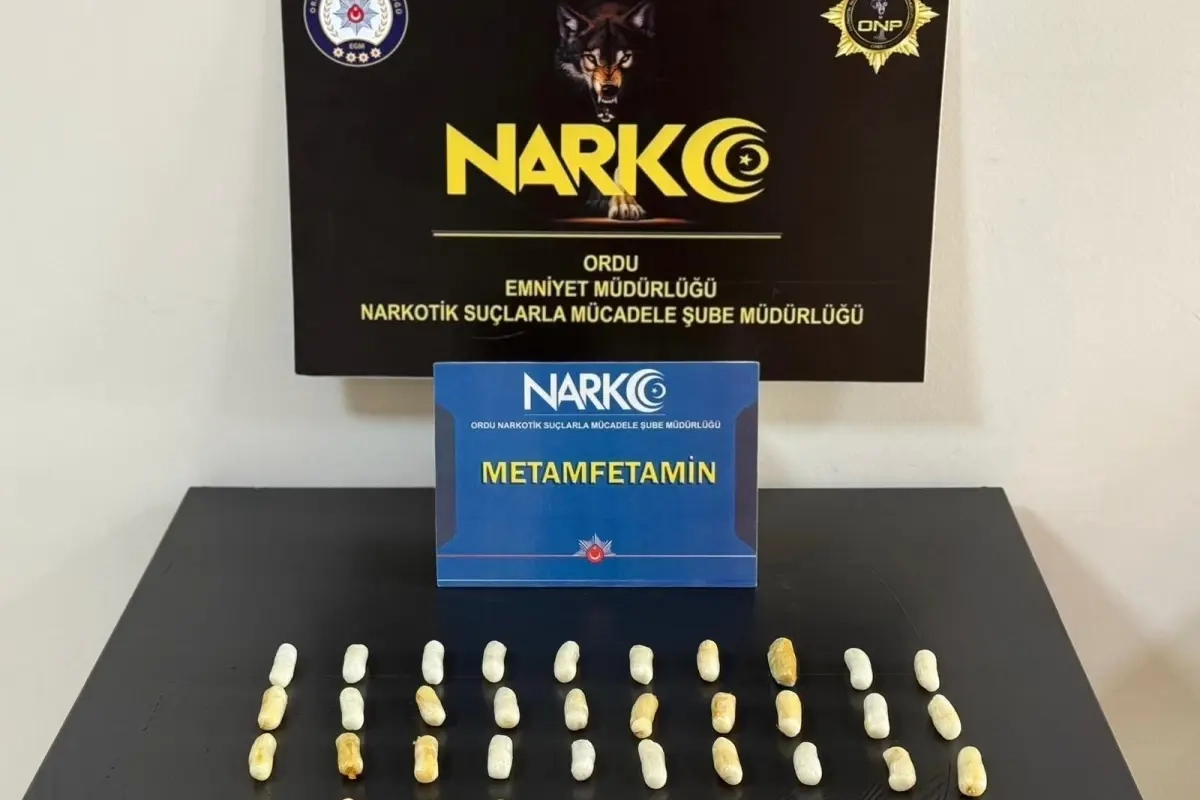 ORDU'da, polis tarafından yakalanan yabancı uyruklu 2 şüpheliden birinin midesinden 40 kapsül halinde 407 gram metamfetamin çıktı. Gözaltına alınan şüpheliler mahkemece tutuklandı.