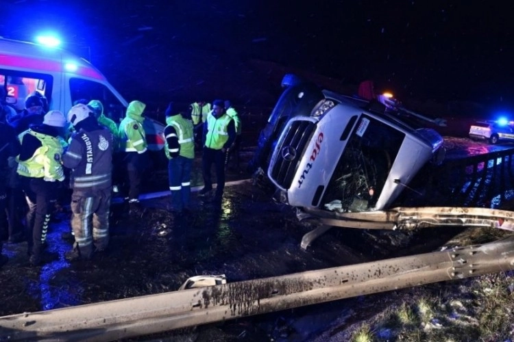 Kuzey Çevre Otoyolu Boğazköy İstiklal mevkisinde İstanbul Havalimanı istikametine seyir halindeki F.S. idaresindeki servis minibüsü kar yağışı sonrası kayganlaşan yolda kontrolden çıkıp bariyerlere çarparak devrildi.