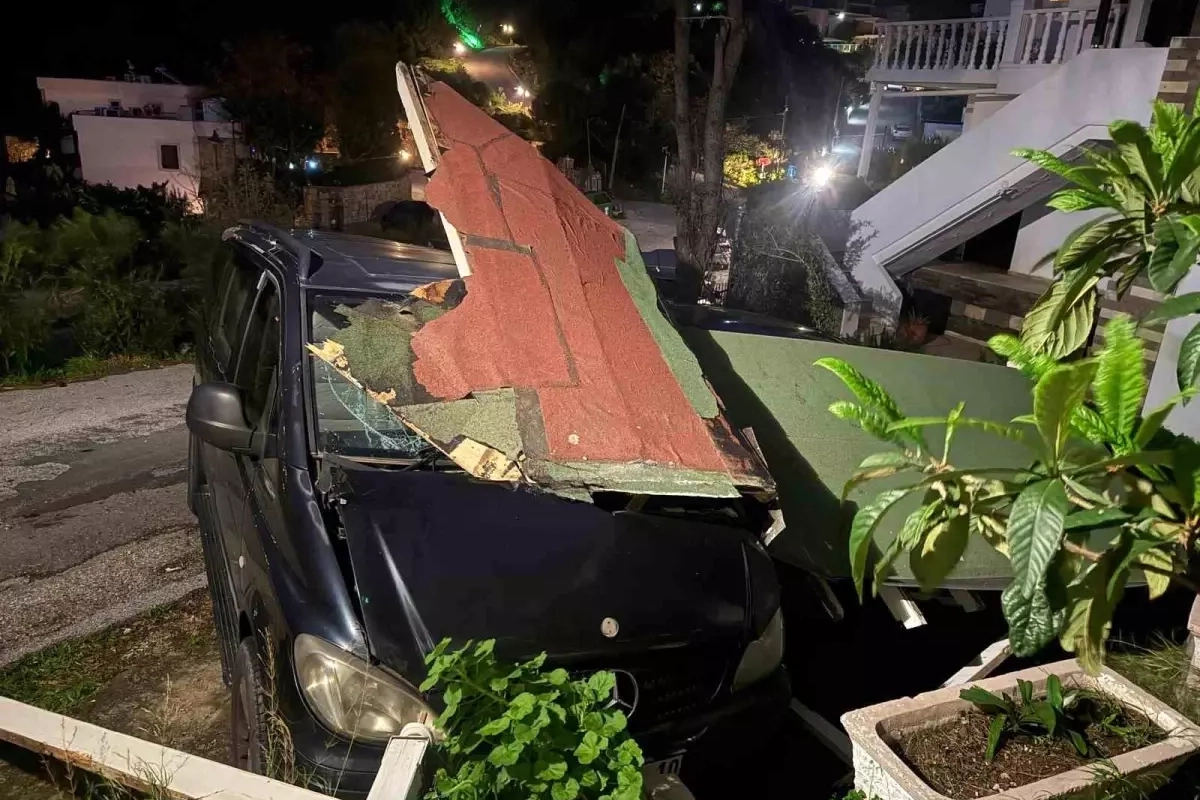 Muğla'nın Bodrum ilçesinde etkili olan fırtınada yerinden kopan sundurma, park halindeki araçların üzerine yıkıldı.