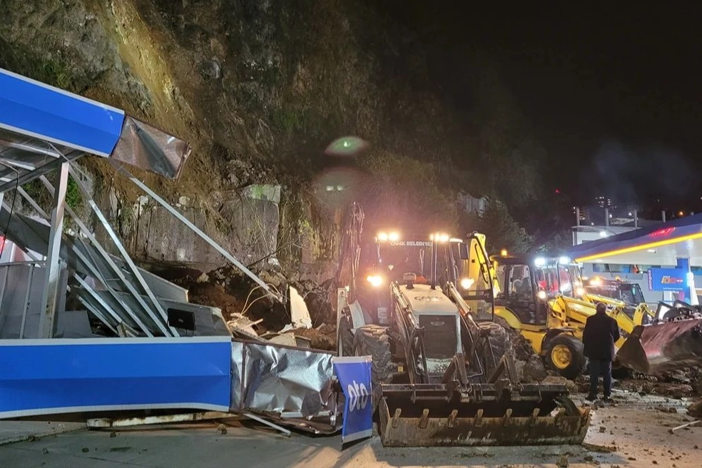 Canik ilçesi Toptepe Mahallesi'nde Lovelet AVM yanındaki Opet akaryakıt istasyonunda dağdan kopan toprak ve kaya parçaları, akaryakıt istasyonunun oto yıkama kısmına düştü.
