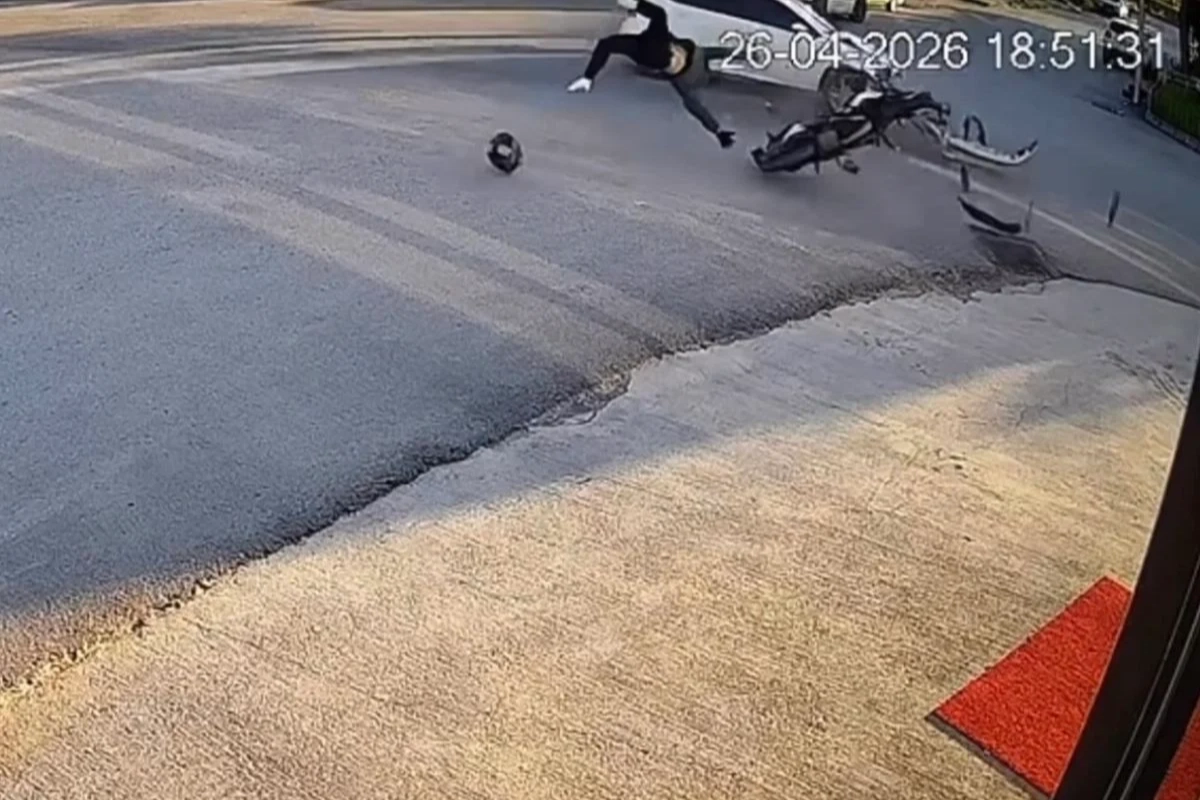 BARTIN'da oto sanayi sitesi içerinde otomobille çarpışan motosikletin sürücüsü ağır yaralandı. Kaza anı bir işyerinin güvenlik kamerasına yansıdı.