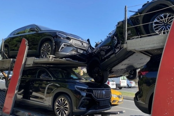 Çarpmanın etkisiyle ön taraftaki sıfır araç, büyük hasar alarak askıda kaldı. Kazayı yara almadan atlatan sürücü ise tırı sağa çekerek polise haber verdi. Olay yerine gelen polis güvenliği sağlayarak trafiği tek şeride düşürdü.