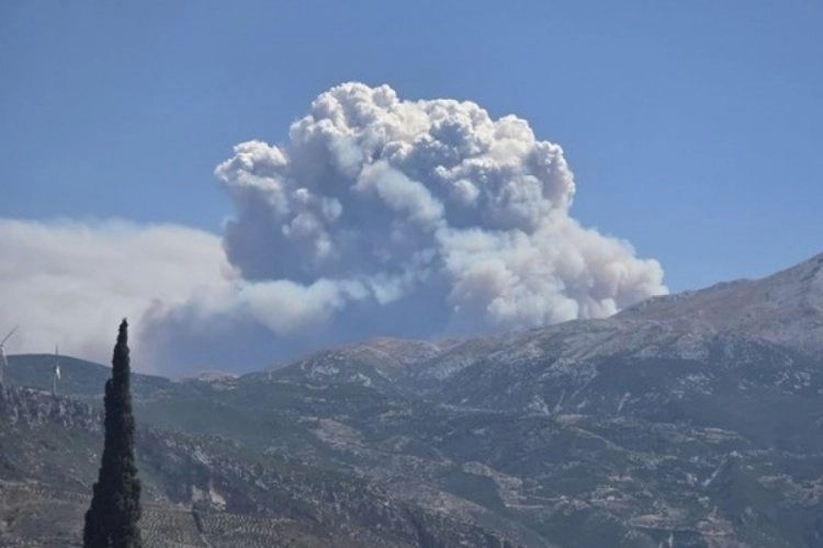 Kel Dağı'nda saat 15.00 sıralarında başlayan yangın nedeniyle oluşan duman, sınırın Türkiye tarafından da görülüyor.