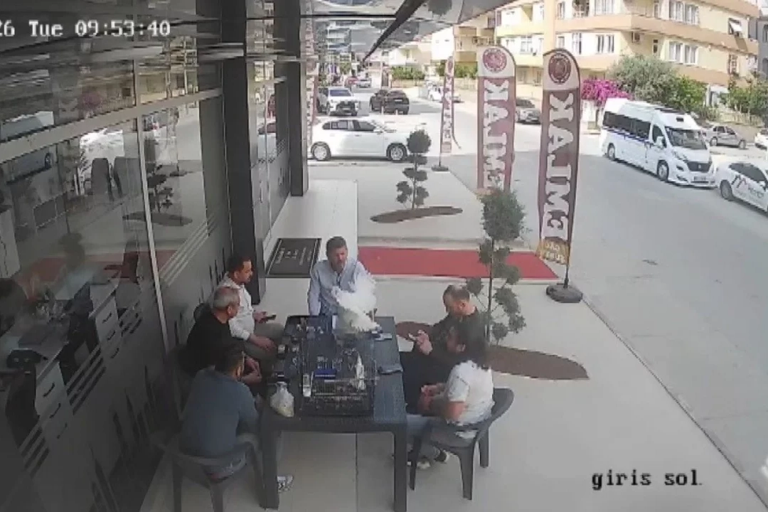 Olay, Öğretmenler Mahallesi 2907 Sokak'ta meydana geldi. Edinilen bilgiye göre, sokak üzerindeki bir emlakçı dükkanı önünde oturan vatandaşlar çay içip sohbet ettiği sırada, karşı binanın üst katlarından bir tavuk aniden uçarak grubun bulunduğu masaya doğru yöneldi.Güvenlik kamerası görüntülerine yansıyan olayda, tavuğun 5. kattan uçarak masaya düştüğü, bu sırada masa etrafında bulunan vatandaşların panikle yerlerinden kalktıkları görüldü. Kısa süreli şaşkınlık yaşayan vatandaşların, olayın ardından gülerek birbirlerine ne olduğunu sorması da dikkat çekti.