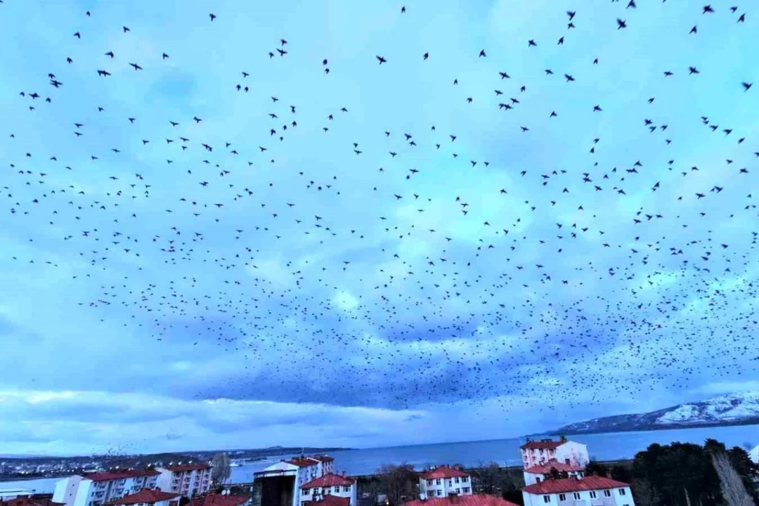 Tatvan ilçe merkezinde görülen doğa olayı sırasında sığırcıkların senkronize uçuşları gökyüzünü adeta kaplarken, ortaya güzel görüntüler çıktı. Gün batımına yakın saatlerde yoğunlaşan kuş sürüsü, kısa süre boyunca ilçe semalarında dalgalı hareketler sergiledi.