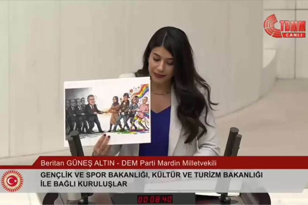 TBMM Genel Kurulu’nda Gençlik ve Spor Bakanlığı ile Kültür ve Turizm Bakanlığı’nın 2026 yılı bütçeleri görüşülürken, DEM Partili milletvekilleri kürsüye üzerinde karikatür bulunan bir döviz bıraktı. Dövizde yer alan LGBTİ+ simgesi, AK Parti grubunun tepkisini çekti.