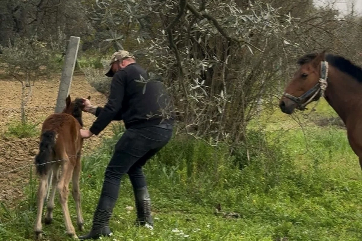 Olay, dün İncirliova ilçesi Karabağ Mahallesi'nde meydana geldi. İlçede esnaflık yapan Durmuş Ali Erdoğan, atıyla doğa gezisine çıktı. Erdoğan, bir tayın bahçeleri ayırmak için kullanılan dikenli tellere takıldığını ve hareket edemediğini gördü. Dikenli tellere dolanan tayı bulunduğu yerden çıkaran Erdoğan, anne ve yavruyu buluşturdu. O anlar cep telefonu kemarasıyla kaydedildi.