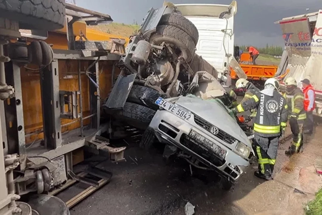 Otoyolun İzmit geçişi Kocaeli Şehir Hastanesi mevkisinde 2 tır, 1 tanker ve 1 otomobilin karıştığı zincirleme kaza meydana geldi. Çarpışmanın etkisiyle mıcır yüklü tır devrildi.
