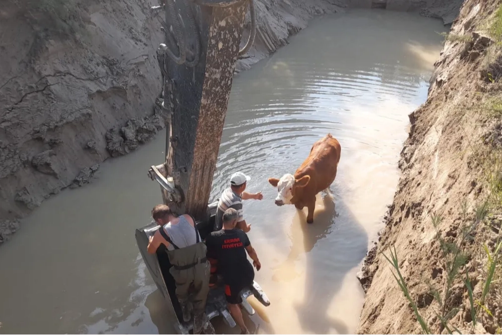 İtfaiye ekipleri, yakınlardaki bir işletmeye ait iş makinesinin desteğiyle gölette mahsur kalan inekleri yaklaşık bir saatlik çalışmanın ardından sağ salim çıkararak sahibine teslim etti.