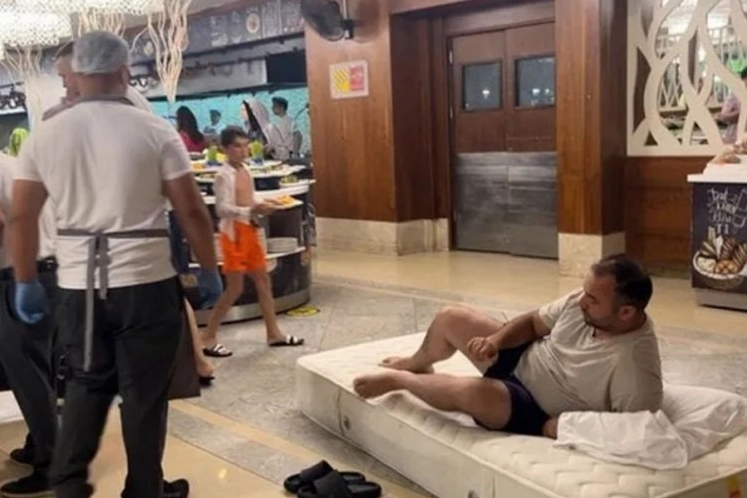 Antalya Belek'teki bir otelde klima arızası sonrası Rus turistlere yeni oda verilirken kendisine yeni oda verilmeyen Türk tatilci yatağını yemekhaneye götürdü.