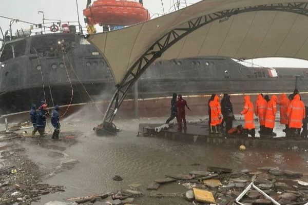 Kıyıya sürüklenen geminin parçası, limanın beton duvarlarına çarptı ve kıyıdaki amfi tiyatroya zarar verdi.