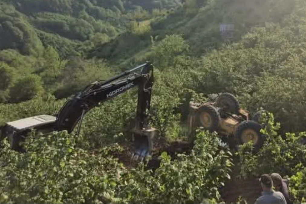 Zonguldak'ın Alaplı ilçesi Gümeli beldesinde yol betonlama çalışması yapan iş makinesi kontrolden çıkarak şarampole yuvarlandı.