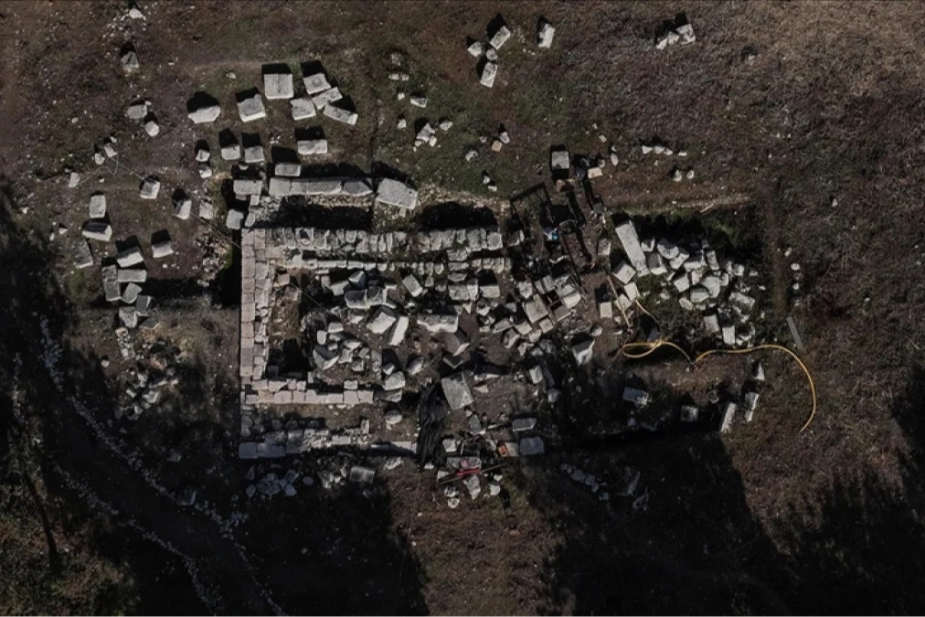 Etrafı Helenistik dönemde yapılmış temenos adlı kutsal duvarla çevrili, tapınak, sunak, stoa (sokak ya da agoranın yanında yer alan, üstü kapalı, sütunlu galeri) ve eksedraların (avlu, salon ya da meydana açılan yarım daire ya da dikdörtgen çıkıntılı niş benzeri mekan) bulunduğu yapı kompleksinin olduğu tahmin edilen adada, öncelikle tapınağın tam mimari planının belirlenebilmesi için çalışmalar devam ediyor.